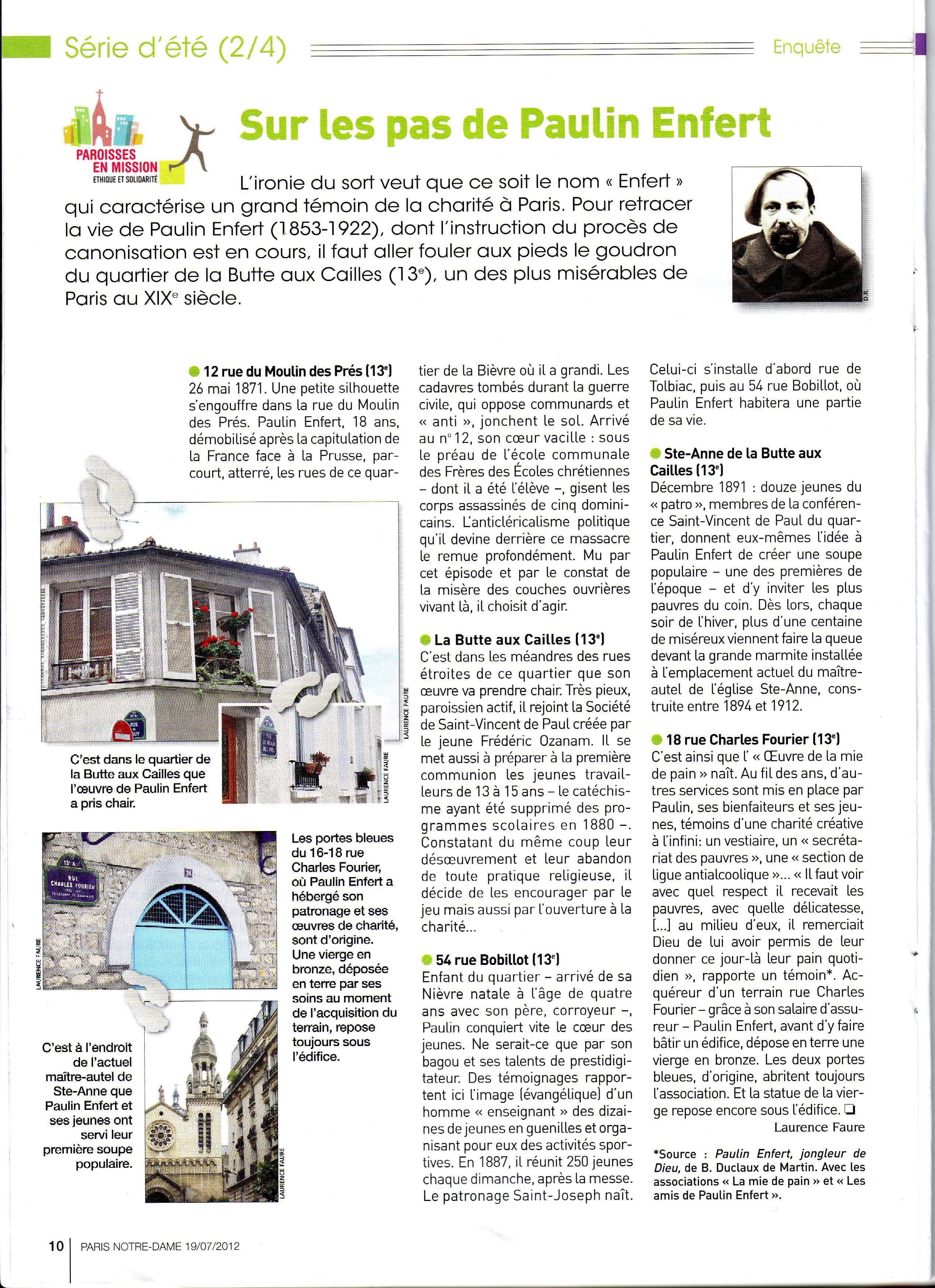 La revue Paris Notre-Dame a consacré dans son numéro du jeudi 19 juillet 2012 au article à Paulin Enfert et par prolongement à notre association.