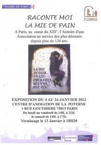 L’exposition “Raconte-moi la Mie de Pain” , est organisée au Centre d’animation de la Poterne, 1 rue Gouthière, dans le 13ème arrondissement de Paris du 4 au 24 janvier 2012